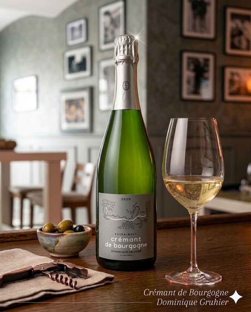 Crémant Dominique Gruhier Extra suchý, minerální, kvasnice, chléb, citrusy.